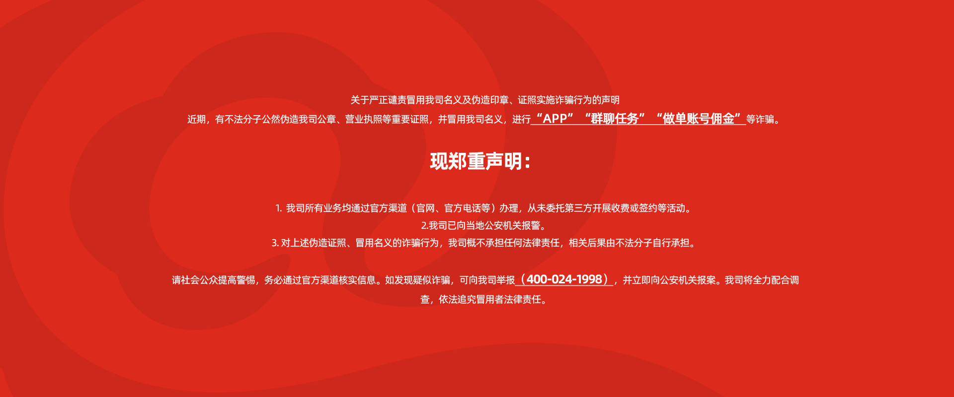 关于严正谴责冒用我司名义及伪造印章、证照实施诈骗行为的声明 近期,有不法分子公然伪造我司公章、营业执照等重要证照,并冒用我司名义,进行“APP”“群聊任务”“做单账号佣金”等诈骗。 现郑重声明: 1. 我司所有业务均通过官方渠道(官网、官方电话等)办理,从未委托第三方开展收费或签约等活动。 2.我司已向当地公安机关报警。 3. 对上述伪造证照、冒用名义的诈骗行为,我司概不承担任何法律责任,相关后果由不法分子自行承担。 请社会公众提高警惕,务必通过官方渠道核实信息。如发现疑似诈骗,可向我司举报(400-024-1998),并立即向公安机关报案。我司将全力配合调查,依法追究冒用者法律责任。