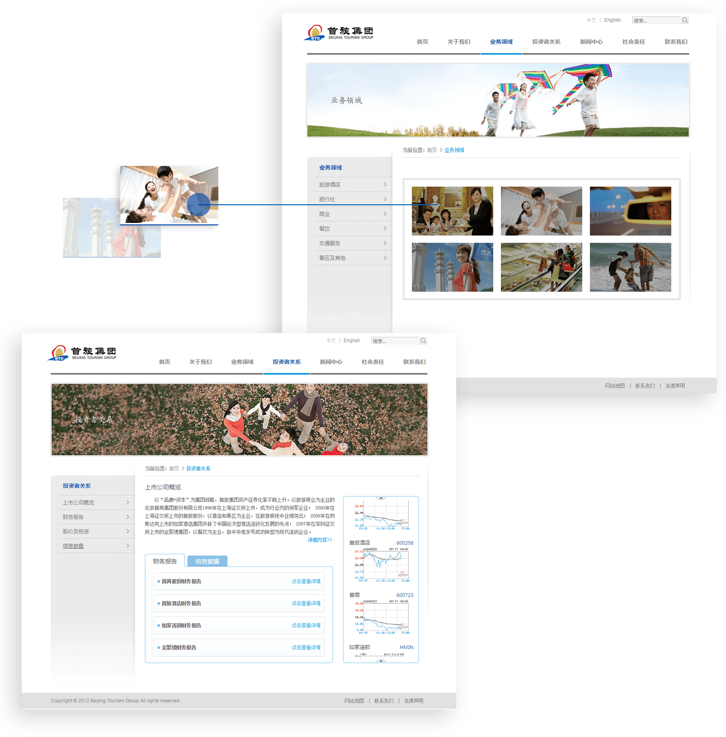 网站以“历史与现代”相结合的视觉效果,表现首旅集团作为知名的旅游服务企业的品牌形象。