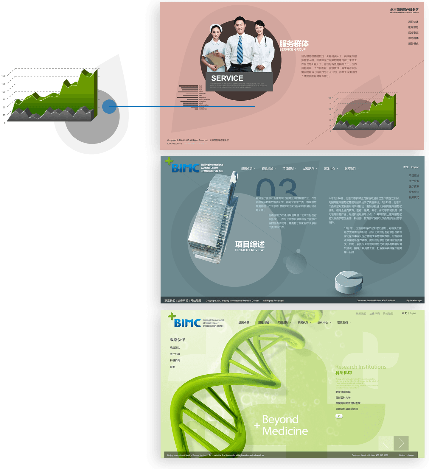 网站利用视频元素和FLASH技术,实现三维立体的动画表现,展示北京国际医疗服务区全貌,形成强烈的视觉感受,塑造北京国际医疗服务区的品牌形象。同时,网站中大量鼠标交互效果,充分调动访问者的兴趣,提升用户的浏览体验。
