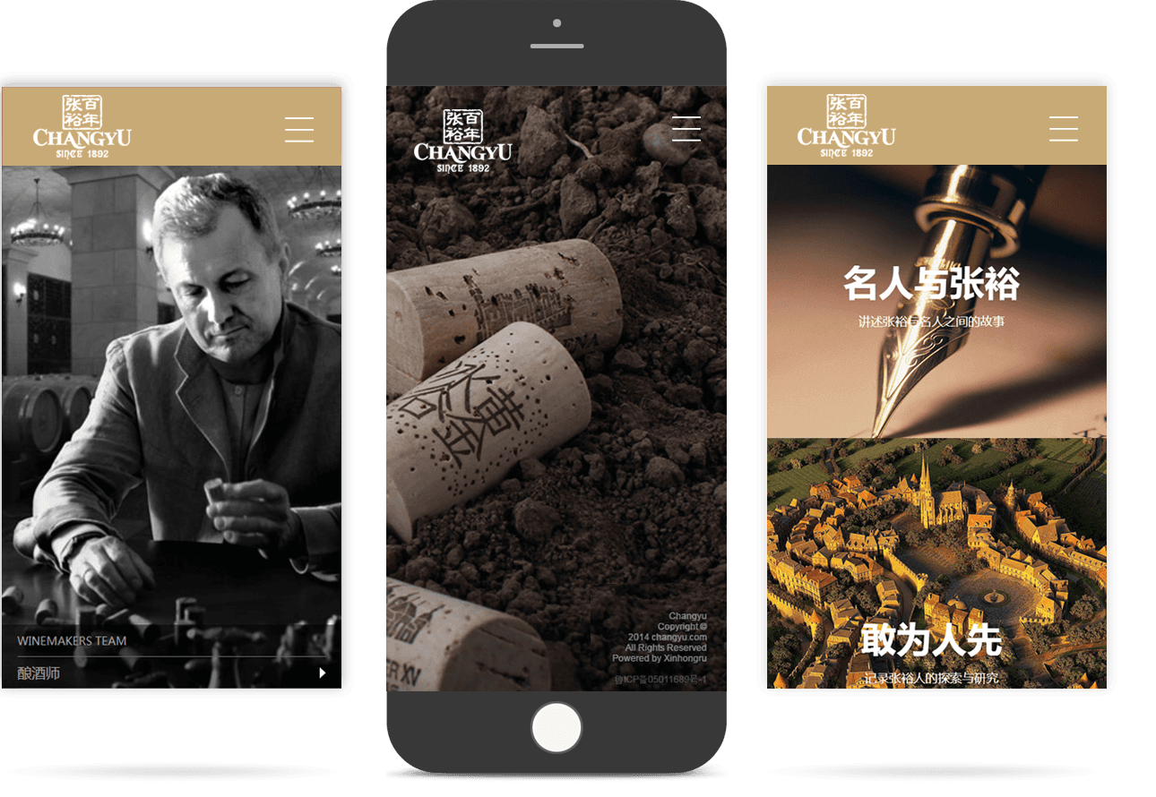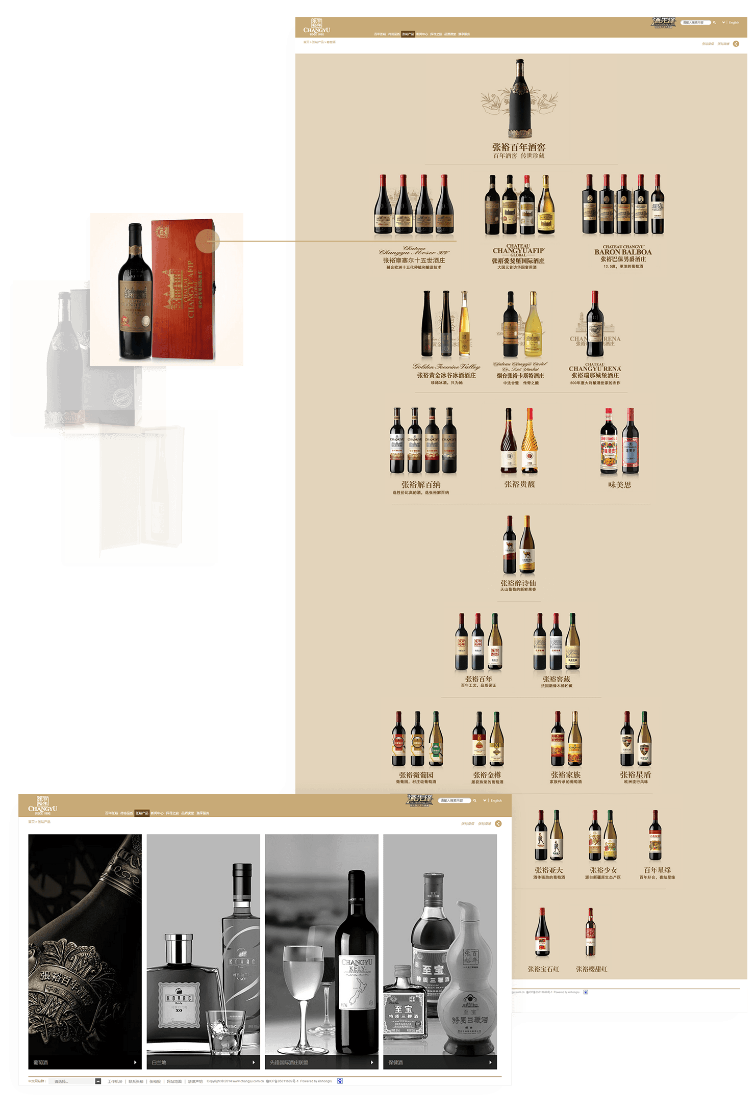 网站设计将传统工艺感与现代科技感有机融合,氤氲着葡萄酒文化以及百年中国古典韵 味,彰显百年张裕的独特品质感。