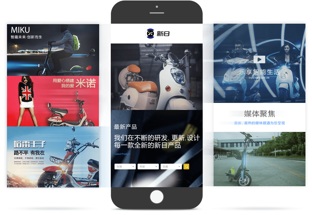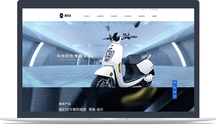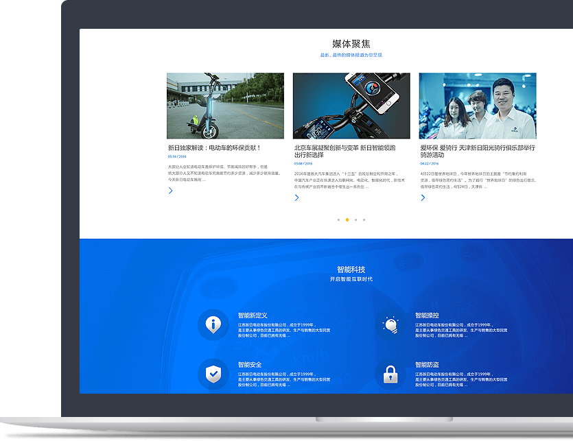 新日电动车官网以品牌为核心,以产品为基础,通过JS/CSS3交互技术、全屏视频等方式, 塑造企业创新、智能的品牌形象。