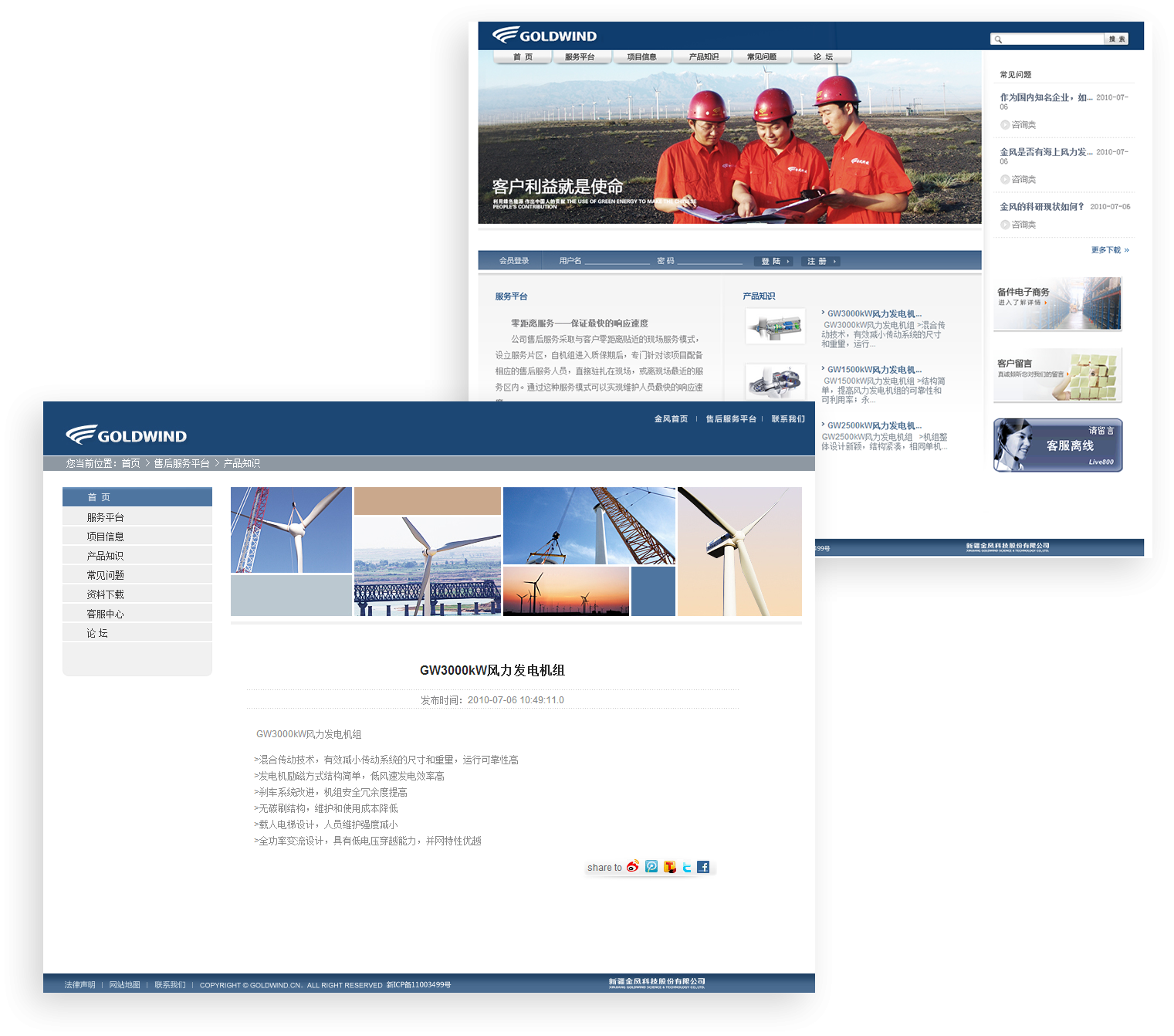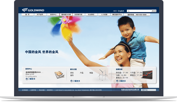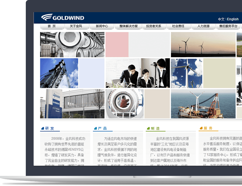 网站整体设计契合企业的领域属性,兼顾品牌与产品双重需求,视觉效果简洁大气,成 功塑造金风科技创新、科技、国际化的品牌形象。