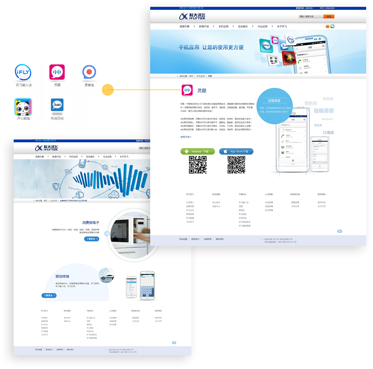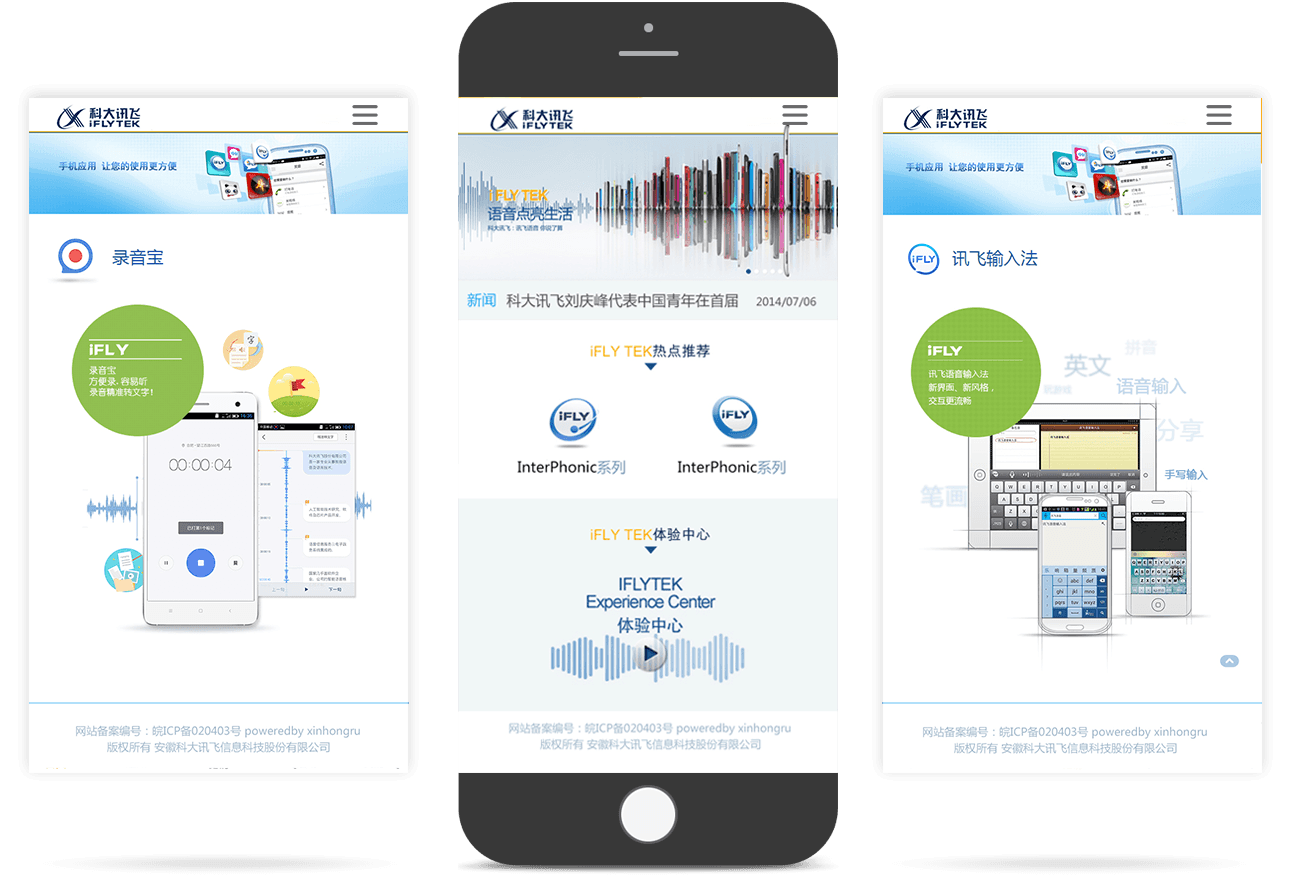 网站以蓝色为主要色调,以“语音引擎-教育产品 -手机应用-互动音乐-行业应用-关于讯飞”为主要栏目导航, 既宣传了产品,又树立了企业品牌形象,同时取得了和用户进行相关语音产品知识普及的互动效果,帮助语音技术在互联网 开辟了新的传播阵地。