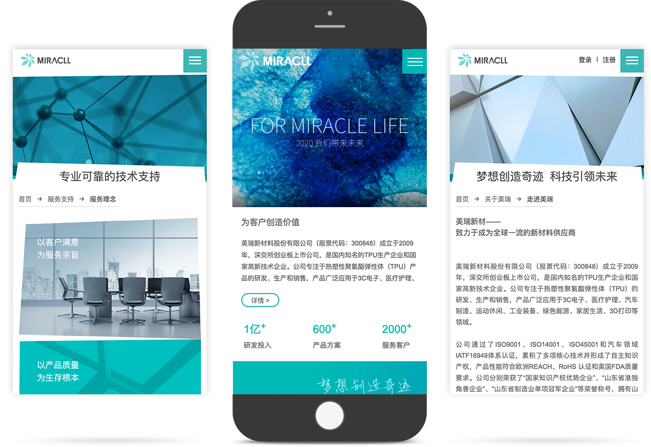 在保证视觉效果的同时简化所有繁冗设计,版块划分采用不规则图型, 从视觉体验和使用体验两个层面提升用户体验,用孜孜不倦的匠心和永续创新的产品,不断谱写新材料领域的新篇章。