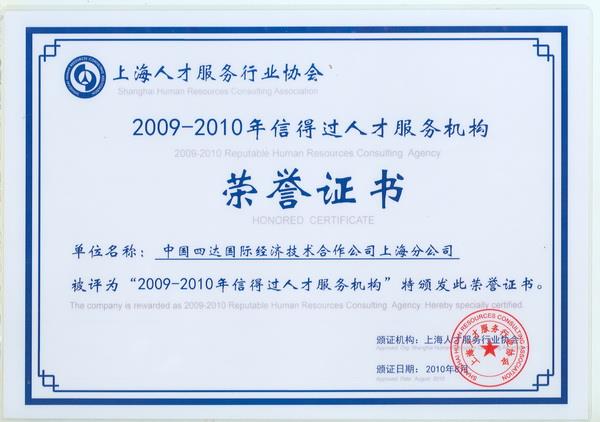 在中国四达星空网·官方端网站全体员工的团结努力下,近日,在上海人才服务行业协会评选的“2009—2010年上海市信得过人才服务机构”活动中,我星空网·官方端网站荣获了“信得过人才中介机构”的荣誉称号,至此,星空网·官方端网站已连续八年获此殊荣。