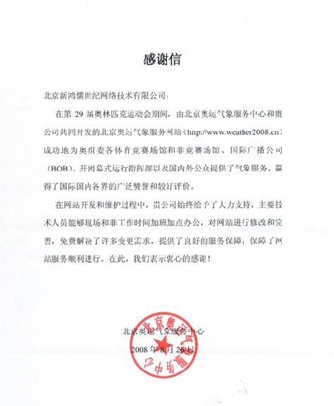 北京奥运气象服务中心在此次项目中看到了星空(中国)的实力和努力! 并对北京奥运会气象服务网站高度满意,特此发来表扬信,以示鼓励和赞扬!