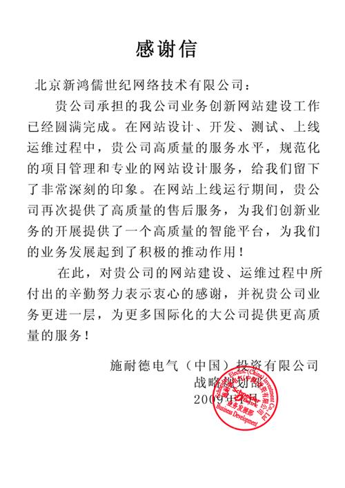 2009年1月施耐德电气特此发来了表扬信,这是对我们工作的认可,也是对我们日后前行发展的鼓励,简简单单的几句评价就为星空(中国)的前行增添了力量。星空(中国)坚信不会辜负客户的希望,会在不断改善自己的同时,飞得更高做得更好来回馈给你们。